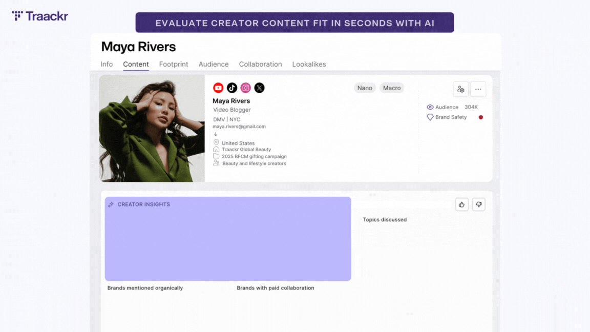 To solve this challenge, Traackr has launched AI Content Summaries, a new feature that allows marketers to instantly evaluate a creator’s content fit. By providing an AI-powered snapshot of voice, tone, topics, and brand mentions, marketers can move through vetting faster and with greater confidence.