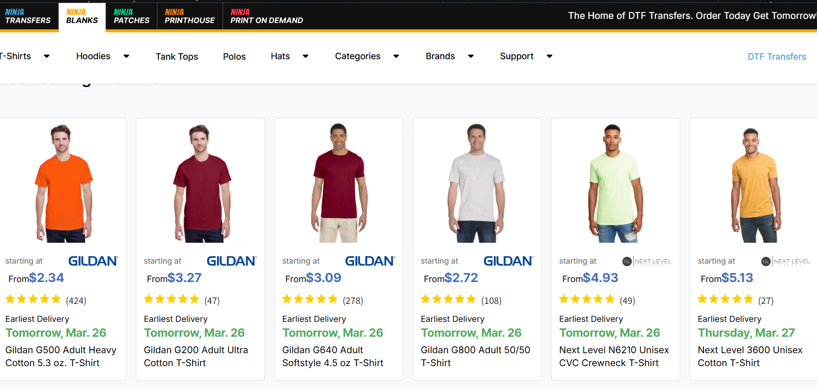 Ninja Transfers, a DTF-printing company, features blank T-shirt collections for different customer groups segmented by needs: Tank Tops, Pocket Shirts, Raglan T-shirts, etc.