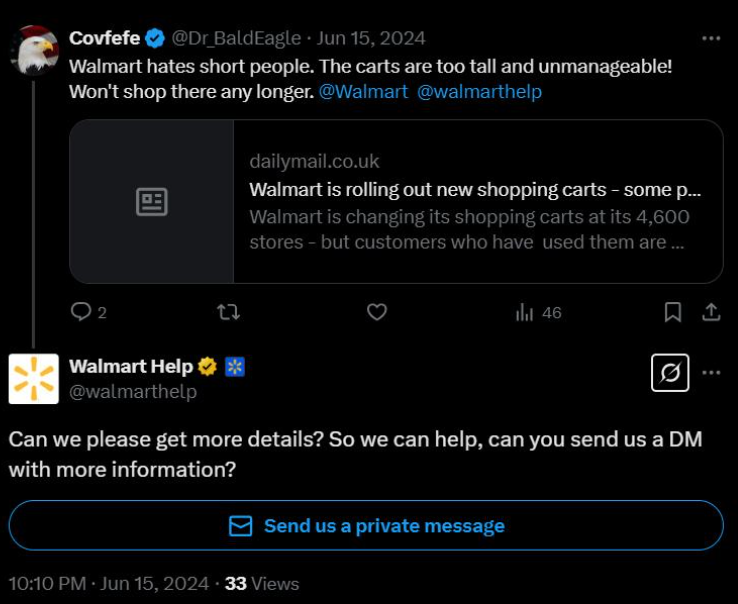 Amid the 2024 PR crisis with shopping carts, Walmart Help Center also stepped in to address customer concerns on social media.