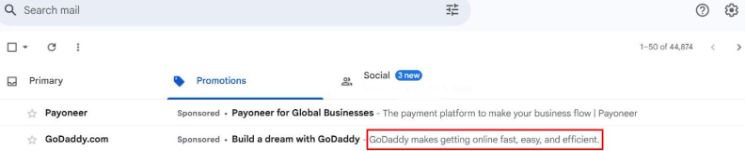 With Google Analytics for Gmail advertising campaigns, you may analyze and modify subject lines and preheaders on the go to boost your ad ROAS. Compare two email ads from GoDaddy with different preheader texts.